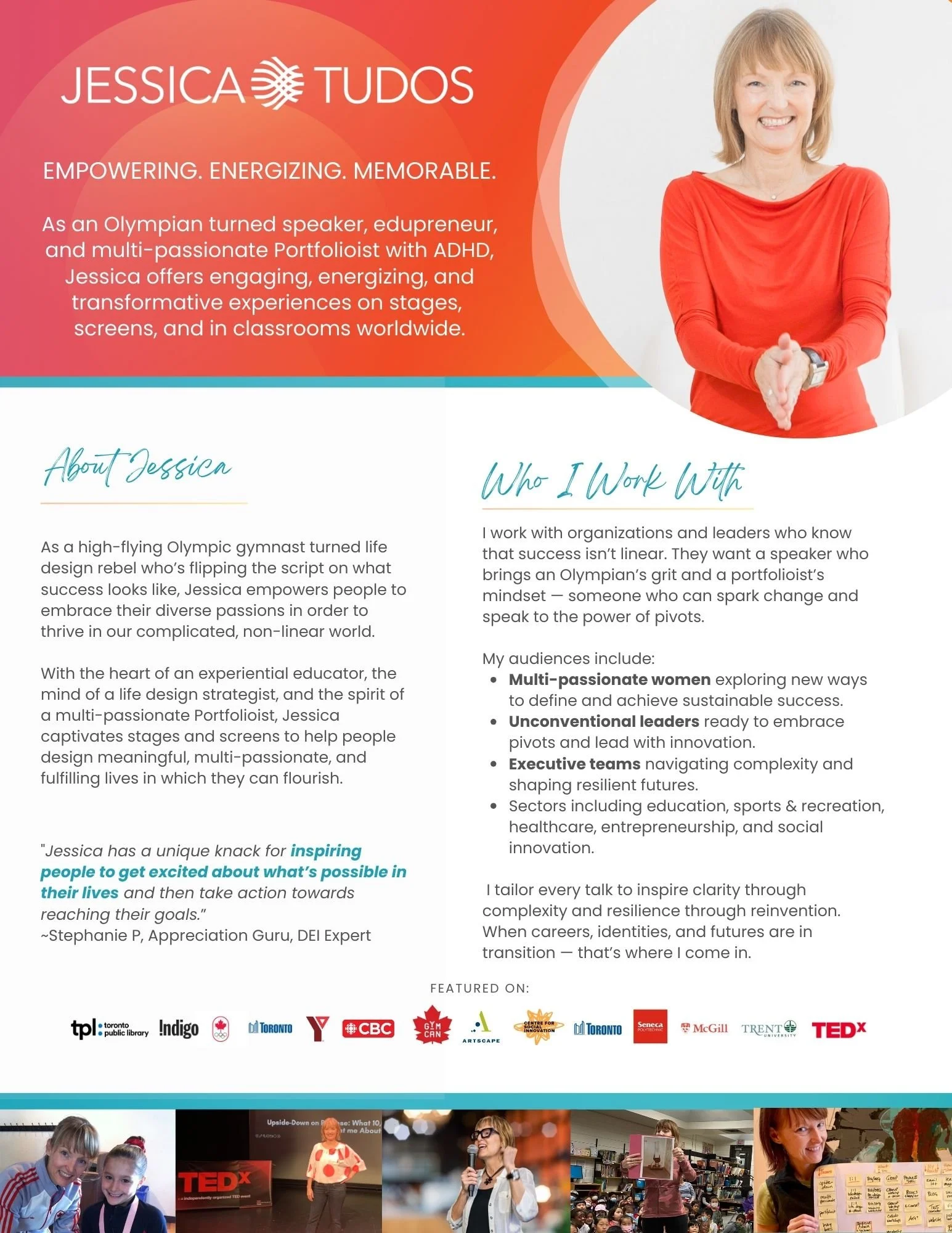 A Canadian Olympian turned multi-passionate edupreneur, speaker, and life design strategist, Jessica has been creating transformational experiences for 25+ years. Having navigated 65+ jobs in 40+ countries (with plenty of flips, flops, twists, and turns along the way, including her Canadian Olympic days), she brings a one-of-a-kind global perspective to every stage, classroom, podcast, panel, and conversation.